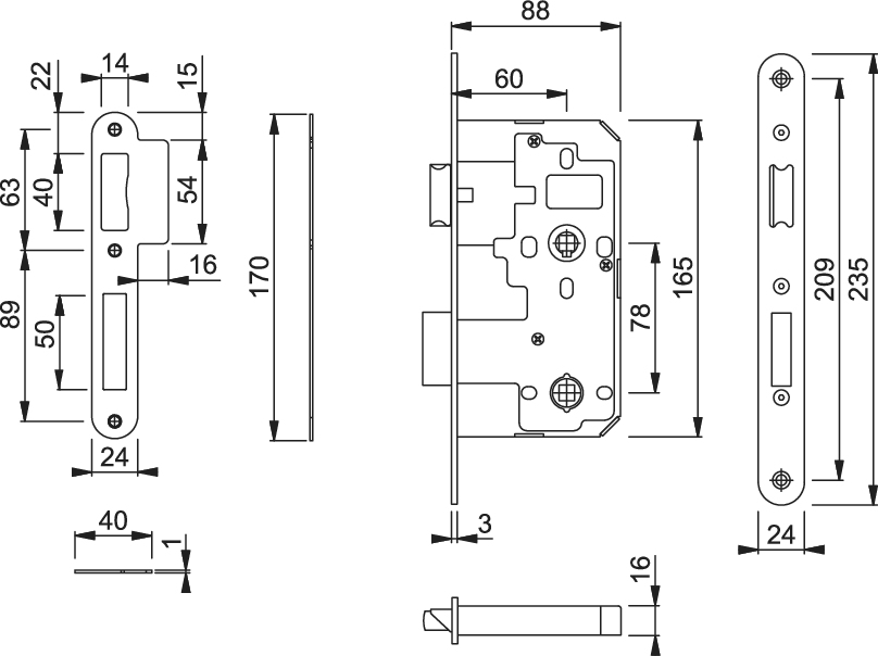 Backset : 60 mm, Pierced For Furniture And Escutcheons At 38 mm Centres