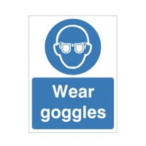 The Wear Goggles Sign is designed to meet UK Safety regulations. It is available in a choice of sizes and materials, including strong 1mm Rigid Plastic, 1mm Rigid Plastic with a Self-Adhesive backing, and a Self-Adhesive Vinyl Sign.